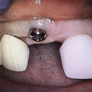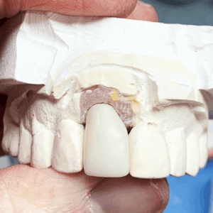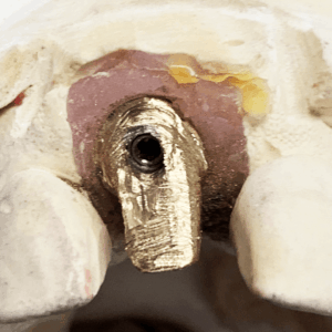 This is an example of an implant case that was placed with an extreme angle. To correct for this, we used a UCLA gold to plastic cast in yellow gold. Our ceramists added pink tissue to mimic the recession at the gingiva on this cement-retained zirconia crown.
